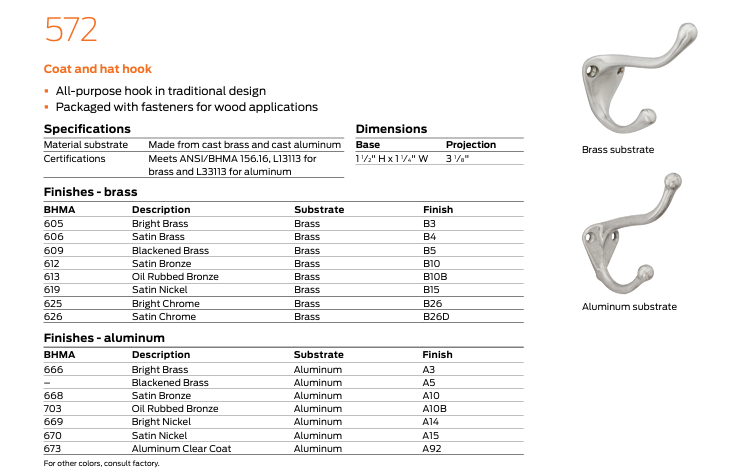 - Hooks: various hook styles and finishes that complete any office, residential, or personal interior door for hanging coats and hats.