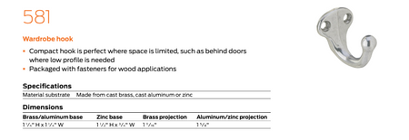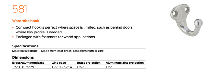 - Hooks: various hook styles and finishes that complete any office, residential or personal interior door for hanging coats and hats.