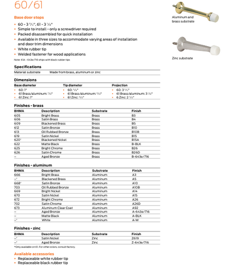 With a full line of wall bumpers, wall holders, kick down holders and hinge pin stops, Ives products are designed to ensure that doors will not slam into the wall. These accessories are typically found on doors without an overhead stop or holder.