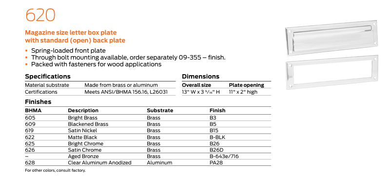 Ives letter boxes are available in many finishes. Please refer to the Ives Full Line catalog for specific product finish availability.