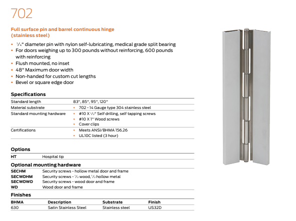 - 700 Series available in 630 (US32D) satin stainless steel