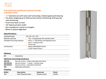 702 FULL SURFACE PIN AND BARREL CONTINUOUS HINGE - STAINLESS STEEL