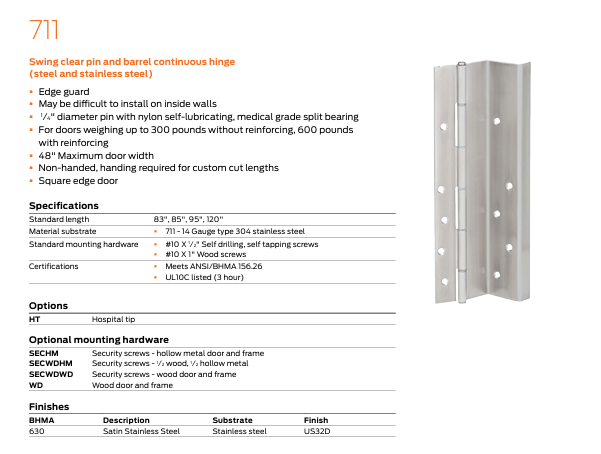 711 SWING CLEAR PIN AND BARREL CONTINUOUS HINGE - STAINLESS STEEL