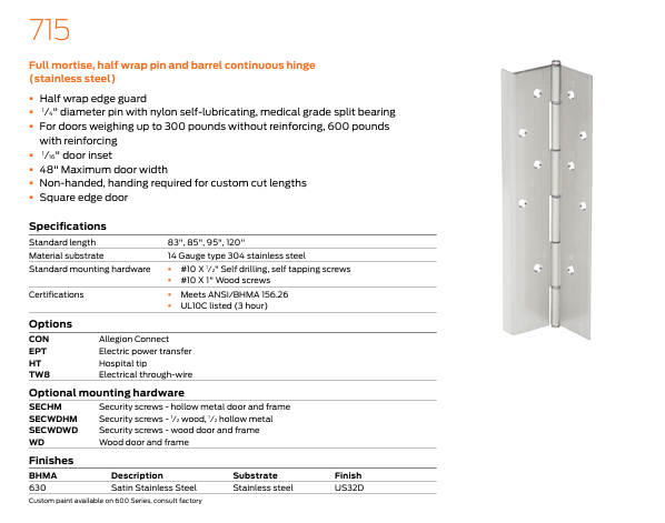 - 700 Series available in 630 (US32D) satin stainless steel