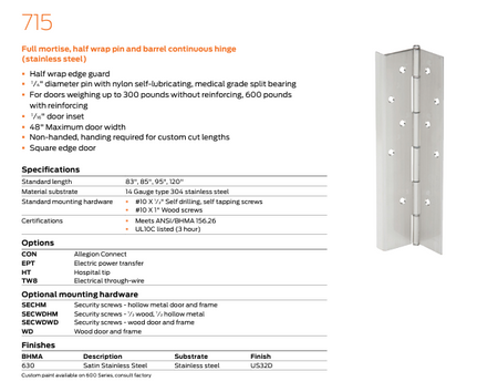 715 FULL MORTISE, HALF WRAP PIN AND BARREL CONTINUOUS HINGE - STAINLESS STEEL