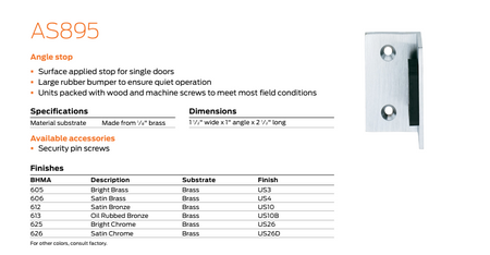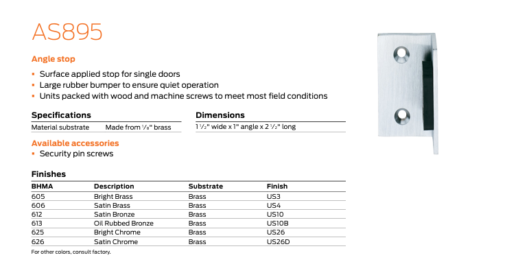 • The angle stop is mounted to the door and pivots to hug the frame
