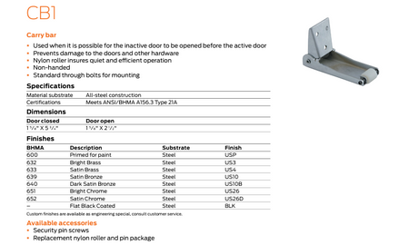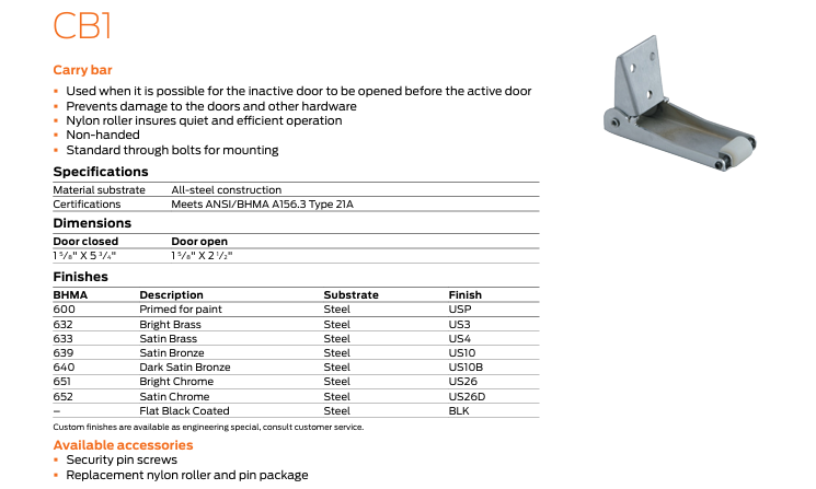 - Carry bar (CBI): Used when the inactive door can possibly be opened before the active door. This prevents damage to the doors and other hardware. A nylon roller ensures quiet and efficient operation. The product is non-handed and includes standard sex bolts for mounting.