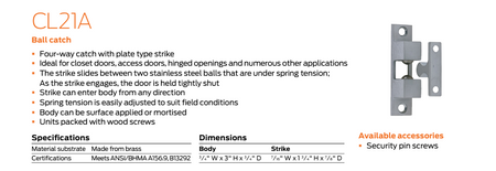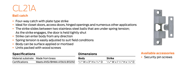 Ives has multiple roller latches and catches that assure a door will stay closed when not in use. These accessories will not keep a door secure and are not meant for security applications; they only help keep a door closed. Ives also offers a variety of surface bolts and door guards to provide an additional security level.