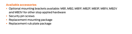 • Mounting brackets (MB1 and MB2): These brackets allow stop-mounted hardware to be properly installed without damaging the COR coordinator, such as a parallel arm closer or a non-fire-rated surface vertical rod strike. Stop-mounted hardware will need to be lowered to compensate for the height of the coordinator and mounting bracket. Fire-rated mounting brackets (MB1F, MB2F, MB3F, MB1V, MB2V and MB3V) are also offered.