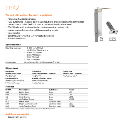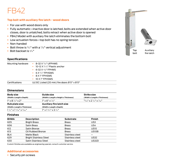 - FB42 Model with auxiliary fire latch eliminates the bottom bolt;