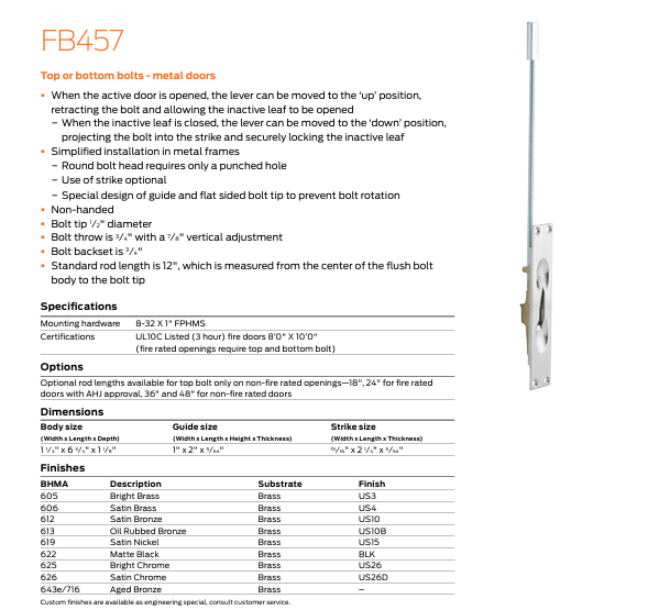 - Flush bolts come in many BHMA standard finishes