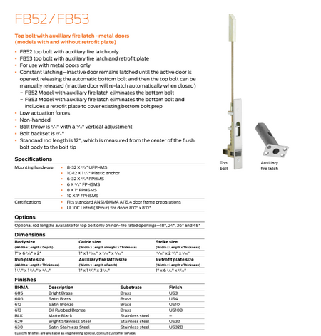 • FB53 Model with auxiliary fire latch eliminates the bottom bolt and includes a retrofit plate to cover existing bottom bolt prep.