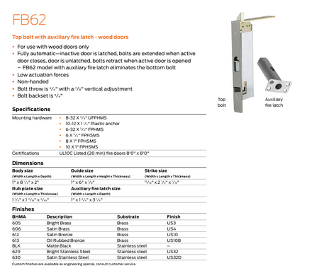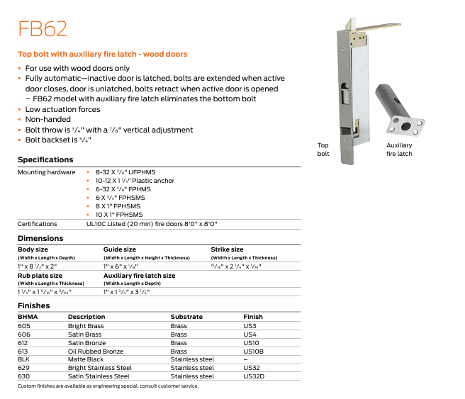 - Fully automatic—inactive door is latched, bolts are extended when active door closes, door is unlatched, bolts retract when active door is opened− FB62 Model with auxiliary fire latch eliminates the bottom bolt;