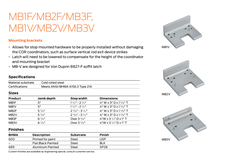 - Mounting brackets (MB1 and MB2): These brackets allow stop-mounted hardware to be properly installed without damaging the COR coordinator, such as a parallel arm closer or a non-fire-rated surface vertical rod strike. Stop-mounted hardware will need to be lowered to compensate for the height of the coordinator and mounting bracket. Fire-rated mounting brackets (MB1F, MB2F, MB3F, MB1V, MB2V and MB3V) are also offered.