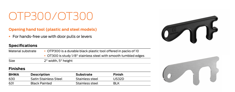 In public buildings, pedestrians frequently touch door pulls, levers, and exit devices. To promote a healthy environment, Ives offers hands-free pulls in a variety of styles and designs that enable pedestrians to operate the door with an arm, elbow, or wrist to avoid contacting surfaces with their hands. Ives' hands-free pulls provide application coverage for wood and metal doors. Designed for durability, they feature rust-free brass or stainless-steel construction.
