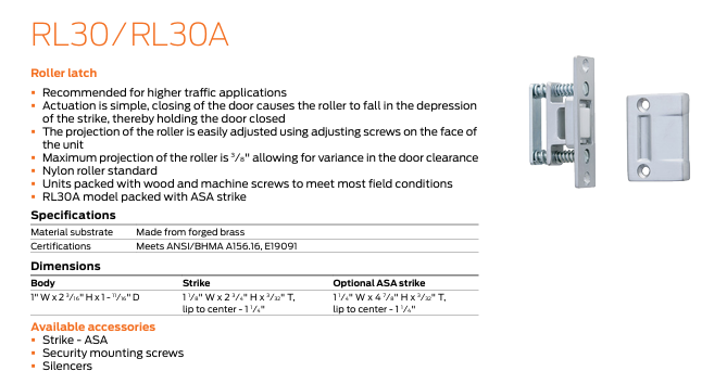 Ives has multiple roller latches and catches that assure a door will stay closed when not in use. These accessories will not keep a door secure and are not meant for security applications; they only help keep a door closed. Ives also offers a variety of surface bolts and door guards to provide an additional security level.