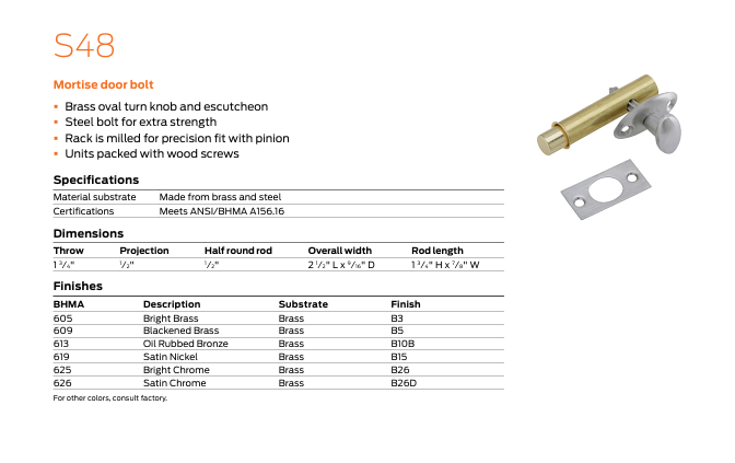 - Practical, rugged, attractive bolt for application on Dutch doors as well as other areas. Chamfered rod end draws the two leaves of the door tightly together;