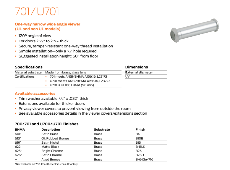 The door knockers and viewers are available in many finishes. Please refer to the Ives Full Line catalog for specific product finish availability.