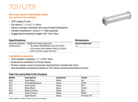 701 ONE-WAY NARROW VIEWER FOR THICKER DOORS