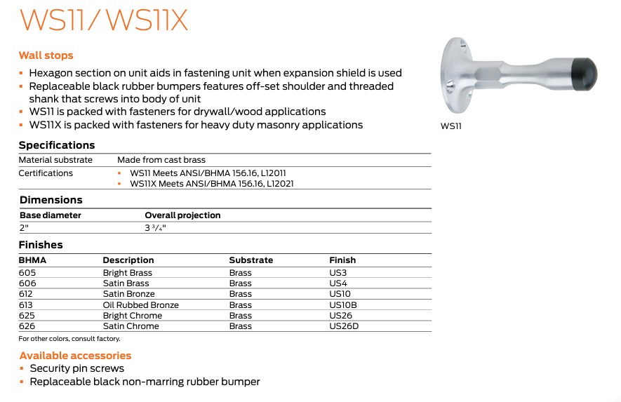 With a full line of wall bumpers, wall holders, kick down holders and hinge pin stops, Ives products are designed to ensure that doors will not slam into the wall. These accessories are typically found on doors without an overhead stop or holder.