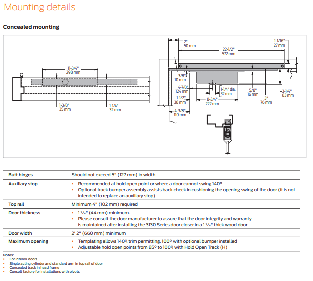 The 3030/3130 Series closers are designed for concealment within 1-3/4” interior doors in medium- to high-traffic areas. Both closer series meet ANSI/BHMA A156.4 Grade 1 and the American Disabilities Act (ADA) reduced opening force requirements. A concealed forged steel single-lever arm and a low-friction track and roller assembly for the 3130 Series and an exposed forged steel double-lever arm for the 3030 Series create optimal door control, with separate regulation of the general closing speed and latching speed. Joints in the 3030 Series arm and shoe adapt to uneven trim.