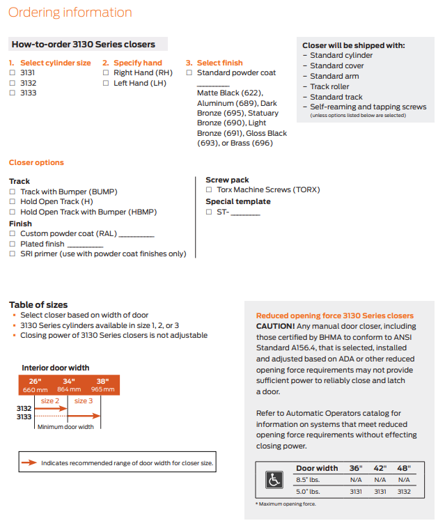 Both the 3030 and 3130 Series are UL and cUL listed for self-closing doors without hold-open and carry a 15-year limited warranty. Materials for the closers include a cast iron cylinder; one-piece forged steel piston; high-efficiency, full-complement, low-friction bearing; tamper-resistant regulating screws; and all-weather fluid.