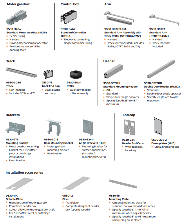 The low-energy electromechanical Senior Swing Series operators are LCN’s heaviest-duty version for high-abuse and high-traffic areas. The Senior Swing Series is backed by a 2-year limited warranty, is UL listed, meets ANSI/BHMA 156.19, the American Disabilities Act (ADA) and ANSI A117.1 requirements for accessibility.