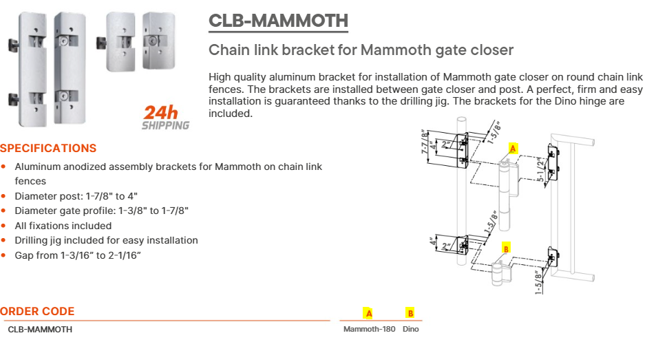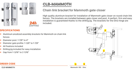 DESCRIPTION TAG: High quality aluminum bracket for installation of Mammoth gate closer on round chain link fences. The brackets are installed between gate closer and post. A perfect, firm and easy installation is guaranteed thanks to the drilling jig. The brackets for the Dino hinge are included.