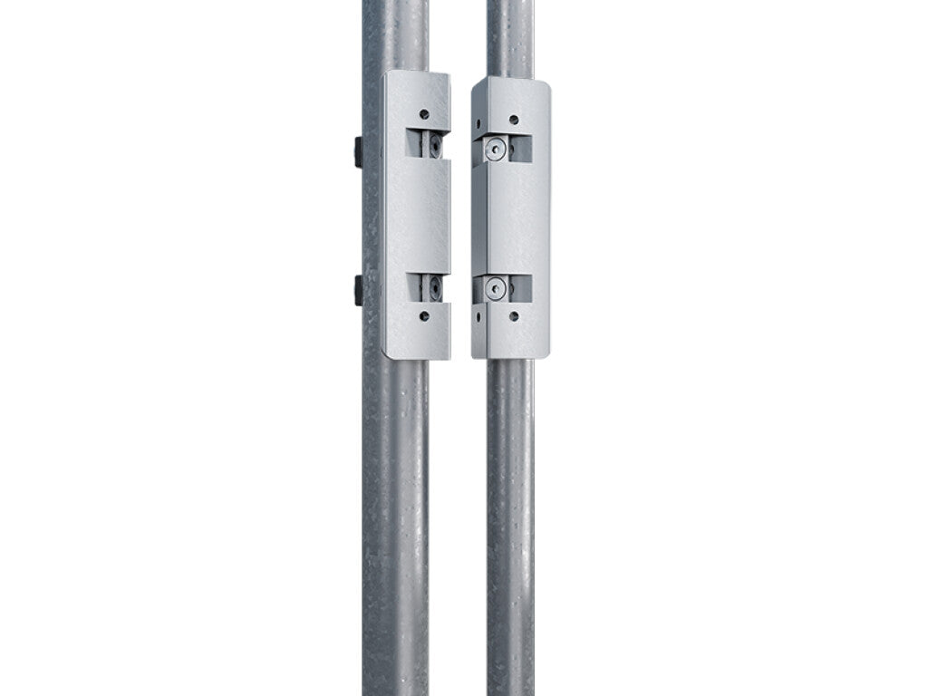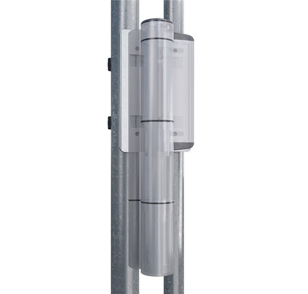 High quality aluminum bracket for installation of Mammoth gate closer on round chain link fences. The brackets are installed between gate closer and post. A perfect, firm and easy installation is guaranteed thanks to the drilling jig. The brackets for the Dino hinge are included.