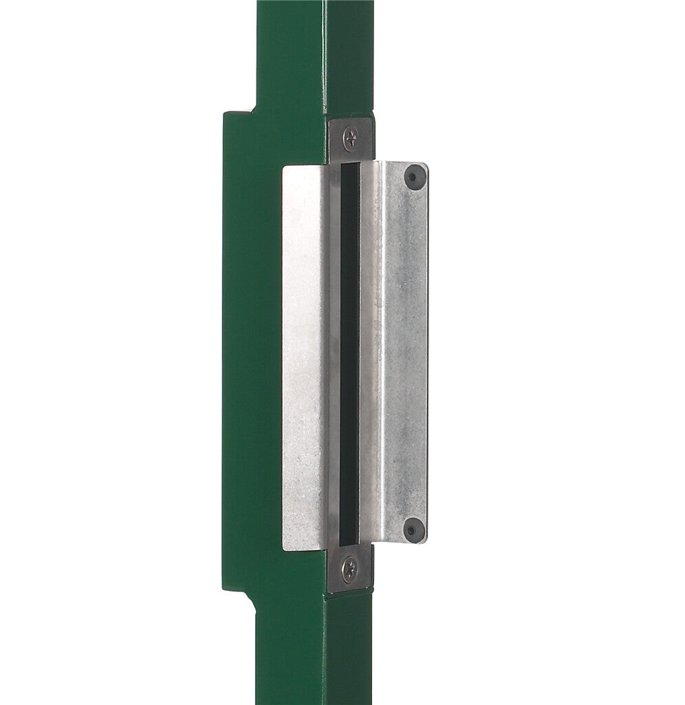 Hybrid keep for Hybrid mortise lock. The welding box in black steel 2-3/8" x 1-9/16", 1/16" thick can be welded into the latch post. The strike plate in stainless steel with integrated stop ensures a finished look and smooth locking. Latch gap: 1/4”