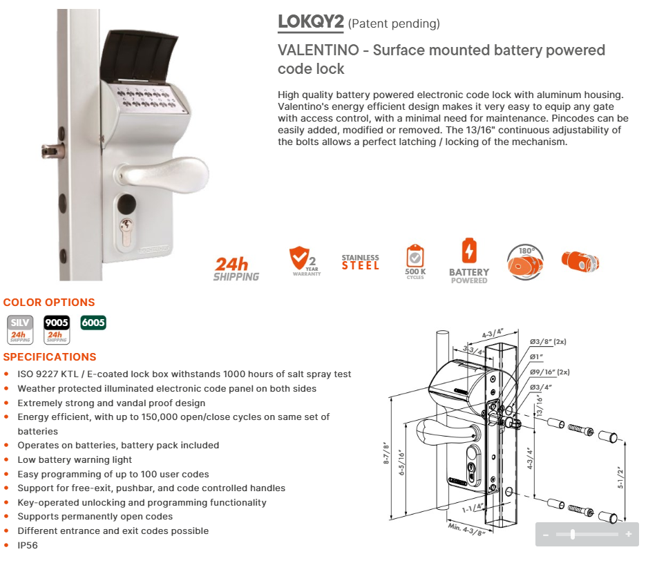 DESCRIPTION TAG: High quality battery powered electronic code lock with aluminum housing. Valentino's energy efficient design makes it very easy to equip any gate with access control, with a minimal need for maintenance. Pincodes can be easily added, modified or removed. The 13/16" continuous adjustability of the bolts allows a perfect latching / locking of the mechanism.