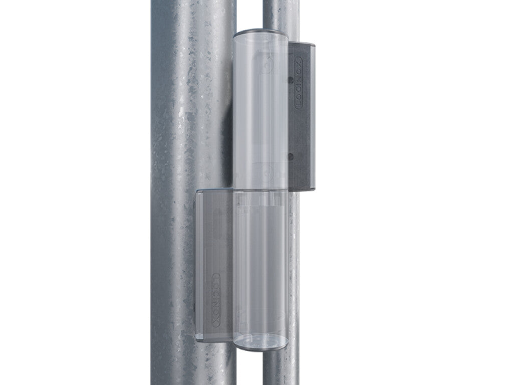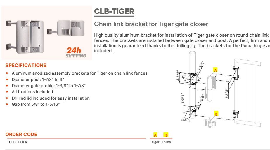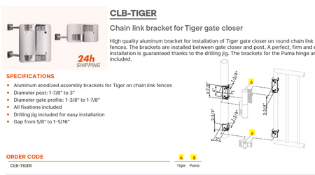 High quality aluminum bracket for installation of Tiger gate closer on round chain link fences. The brackets are installed between gate closer and post. A perfect, firm and easy installation is guaranteed thanks to the drilling jig. The brackets for the Puma hinge are included.