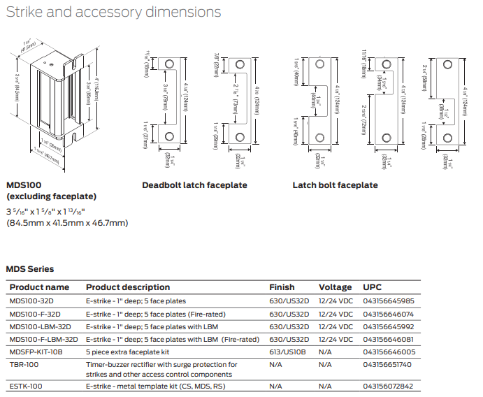 The MDS100 Series electric strike is designed for use with heavy duty mortise locksets and cylindrical locksets. Five different faceplates included for optional flexibility of installation in wood or metal frames.