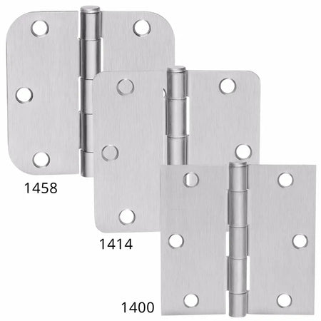 The 1400 (square corners), 1414 (1/4" radius rounded corners), and 1458 (5/8" radius rounded corners) are residential hinges made for lightweight doors in multi-family and other residential applications.