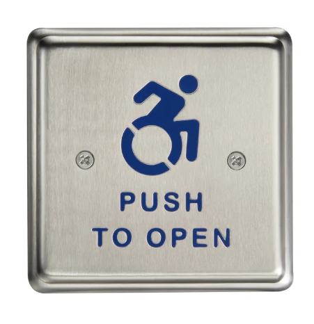 Door switch - 4-1/2" sq. stainless/blue letters, ADA symbol, hardwired