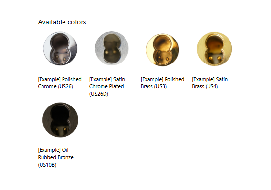 - US26, US26D, US3, US4 or US10B finish. See finish chart.