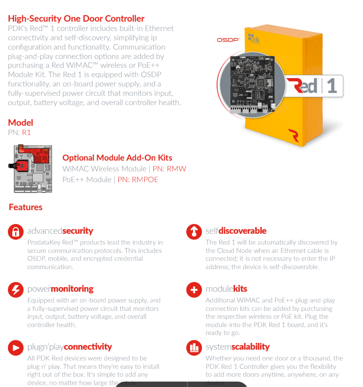 The Red™1, PDK’s one-door controller, includes built-in Ethernet connectivity and self-discovery, simplifying IP configuration and functionality. The Red 1 is equipped with OSDP functionality, an onboard power supply, and a fully supervised power circuit to monitor input, output, battery voltage, and overall controller health.