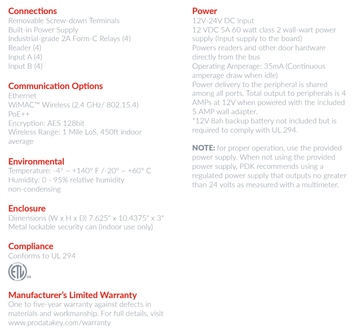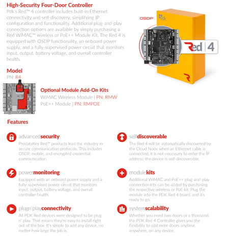 ProdataKey’s four-door controller, the Red™ 4, comes equipped with an onboard power supply and a fully supervised power circuit that monitors battery voltage, outputs, inputs, and overall controller health. Each Red 4 features built-in Ethernet connectivity and self-discovery features, alongside OSDP compatibility. This allows for simple IP configuration and functionality.
