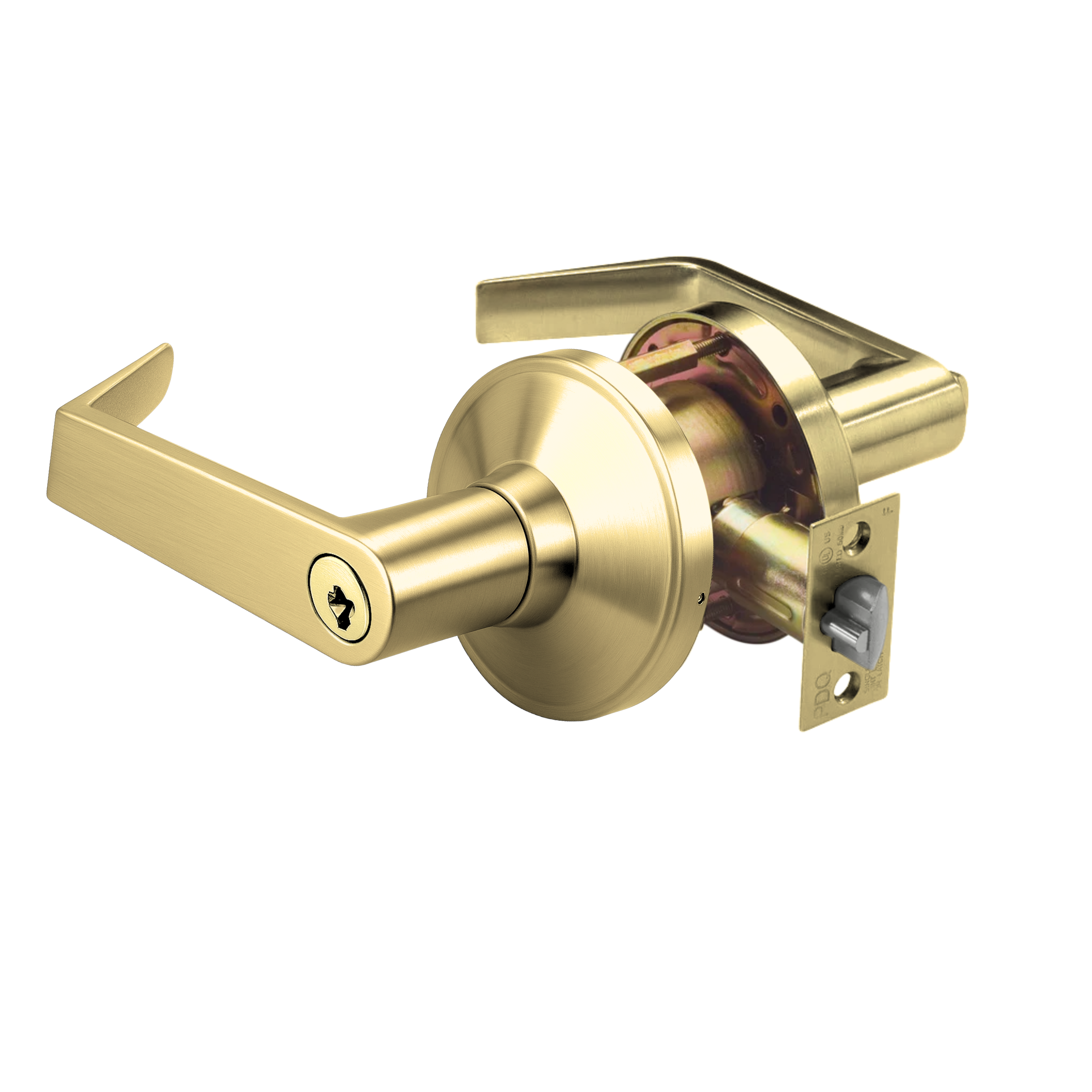 TRIM: Solid diecast PHL, BSN or MIA Levers   41° Lever Rotation Standard with 2-3/4” Backset   Wrought Brass Roses, Concealed Screws   Two (2) per Lock SCC standard (Schlage C Compatible)       Available for all keyed functions Large Format IC Core available for PHL Lever ONLY. 6-pin Brass Insert Cylinder keyed to 5-pins       Options: MK, CMK or GMK      DESIGN AND  MANUFACTURING  IN THE USA 65° Lever Rotation Standard with 3/4” latch for double doors (Ordered from factory only) and all 2-3/8”, 3-3/4” and 5” Backsets  (Ordered from factory only