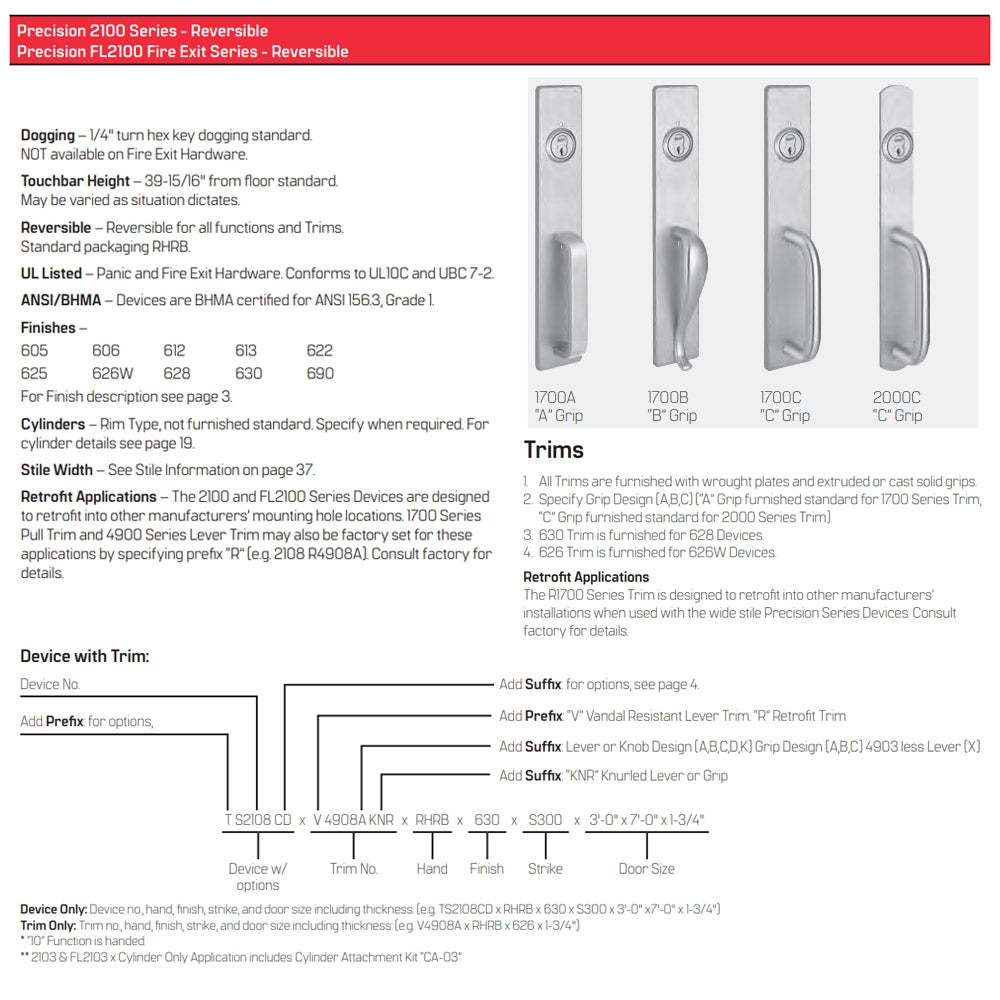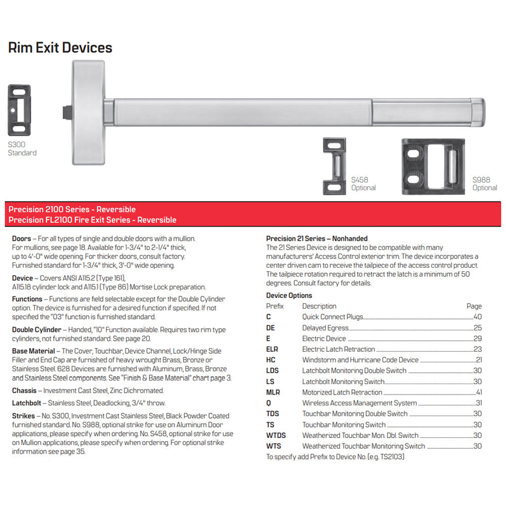 Precision 2100 Series – Reversible Rim Exit Devices  - Fire Rated