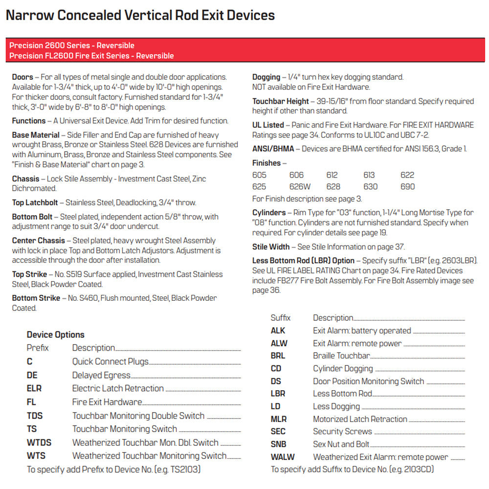 The Precision 2600 Series delivers premium performance in a reversible, narrow stile concealed vertical rod exit device, engineered for reliability, versatility, and architectural appeal. Ideal for metal single and double door applications, this device offers smooth operation and secure latching while maintaining a clean, minimal appearance.