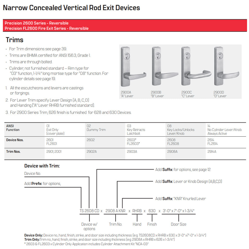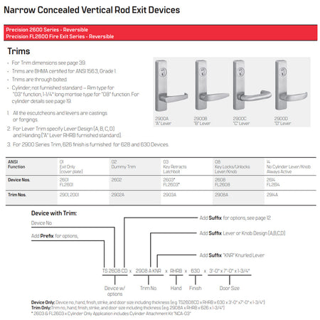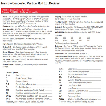 TITLE TAG: Precision (PHI) 2603 Series Narrow Stile, Non-Handed Concealed Vertical Rod Exit Device - 36"/48" Key Retracts Latchbolt - Fire Rated