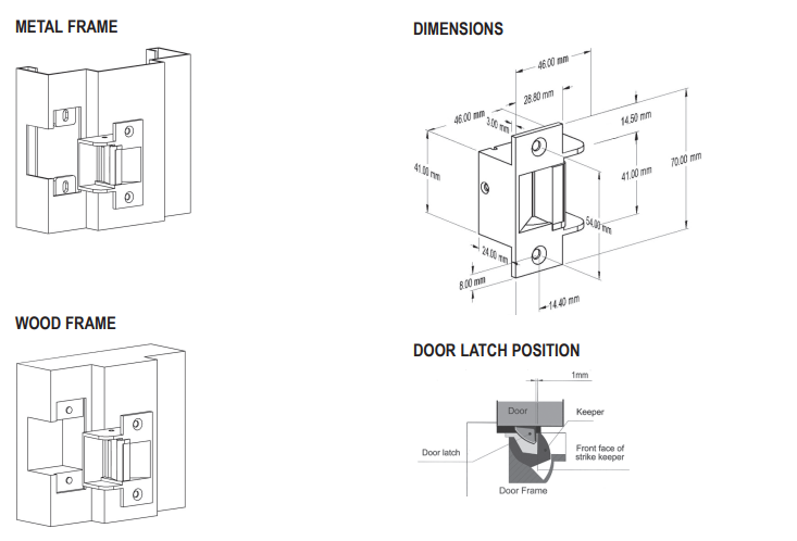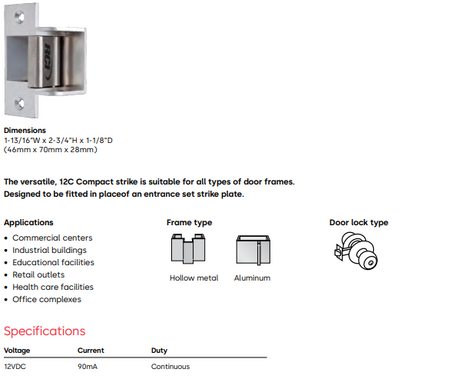 The 12C compact strike is a versatile solution that is suitable for all types for door frames. The RCI 12C strike replaces standard, non-electrified T-strikes with a quick and easy to install electric version. The compact design with dimensions of 1-13/16"W x 2-3/4"H x 1-1/8"D is ideal for wooden, steel, & aluminum door frames.