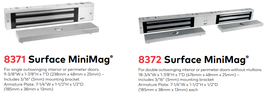 The Surface MiniMag® locks are designed with a 1-7/8” width to keep undersized openings within code. These locks are ideal solutions for traffic control on narrow-style interior or perimeter doors. The RCI 8371 Surface MiniMag® is for single outswinging doors. The RCI 8372 Surface MiniMag® is used for double outswinging doors without mullions. These electromagnetic locks install perfectly alongside most automatic door operators or stop-mounted door hardware. They reduce installation time and eliminate the need for extra brackets.