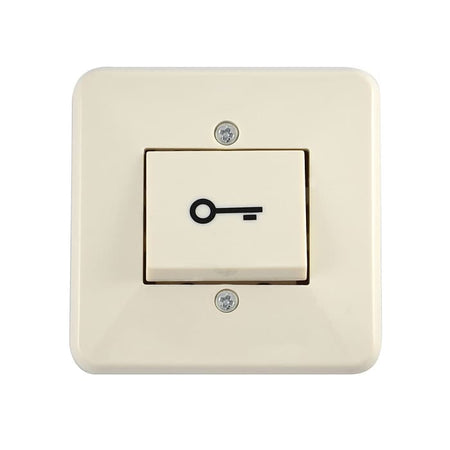 The 909 rocker switch is ideal for desk or wall mount applications. The switch can be surface-mounted with the RCI 909F for concealment under a desk or counter. The rocker switch has a smooth rocker switch action and is available in maintained or momentary versions. The RCI 909 comes with a beige finish and is engraved with a key symbol.