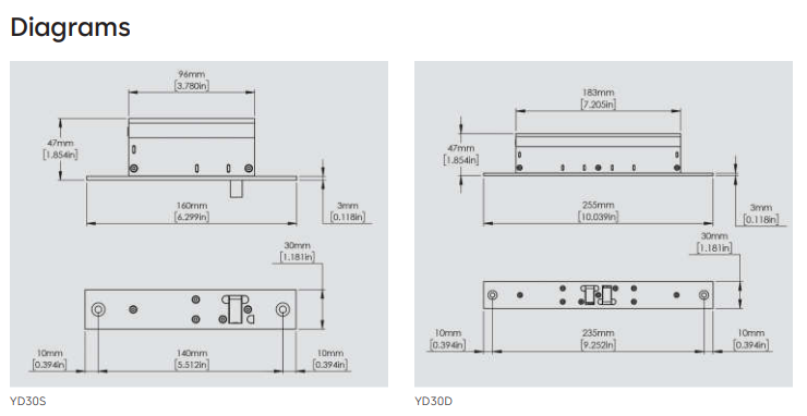 YD30S: 6-1/4” x 1-1/4” x 1-7/8” (160 x 30 x 47mm)