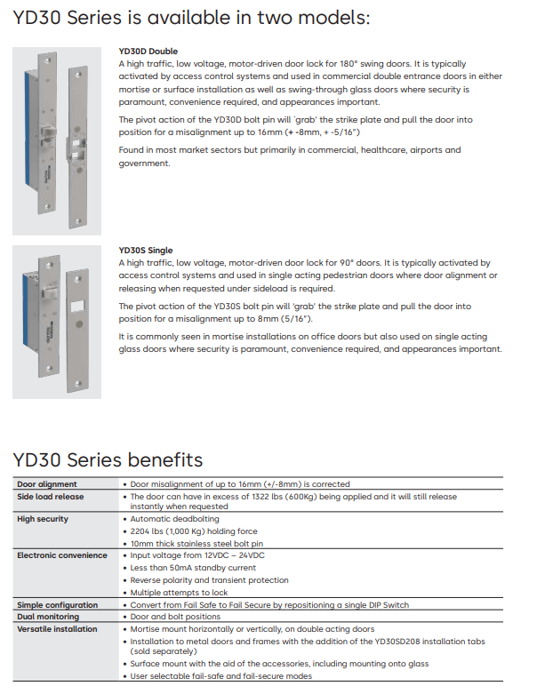 A high traffic, low voltage, motor-driven door lock. RCI YD30 series are typically activated by access control systems and used in commercial entrance doors in either mortise or surface installation as well as swing-through glass doors where security is paramount, convenience required, and appearances important.