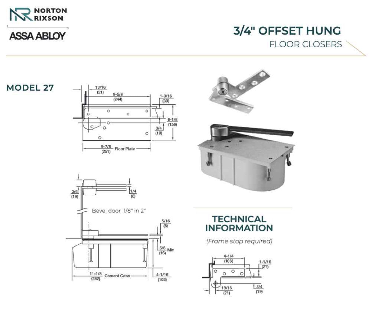 The Norton Rixson 27 Series is a 3/4" offset-hung floor closer designed for standard door frame installation for interior or exterior doors weighing up to 450lbs.