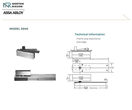 The Norton Rixson 5040 Series is a single-acting, center-hung, shallow-depth floor closer designed for standard glass door installation on interior doors weighing up to 200 pounds.