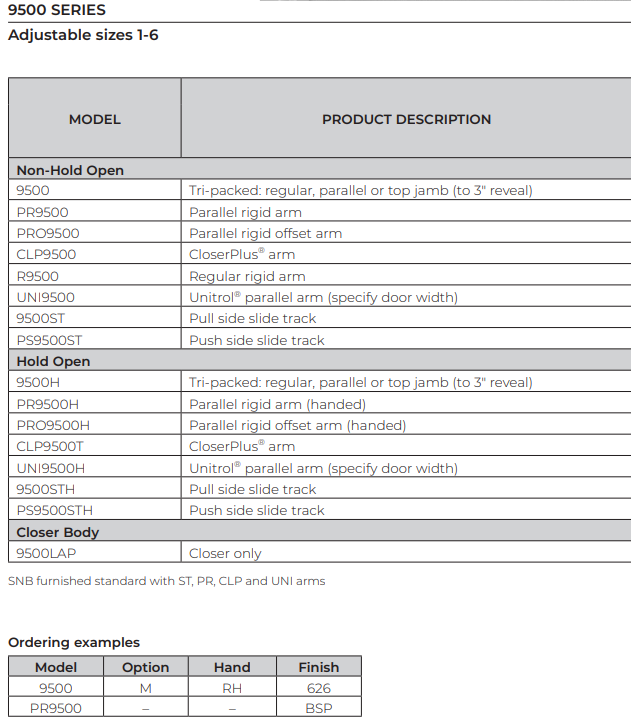• All standard arm applications allow doors to swing 180°, conditions permitting